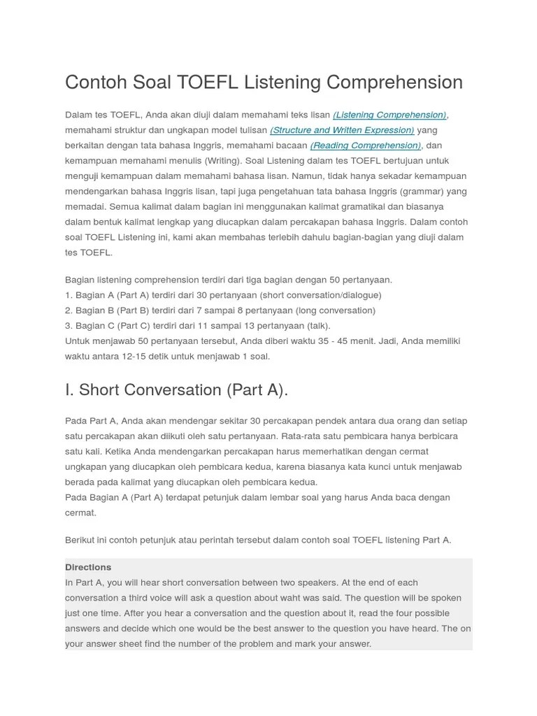 Kami menyediakan 2160 soal dan pembahasan, untuk melancarkan tes toefl . It is too much to read in such a short time. Toefl listening comprehension sample question about short talk. Materi yang diujikan merupakan listening, structure, dan reading. Berikut ini adalah naskah tes bahasa inggris toefl terdiri atas soal+kunci jawaban, script dialog listening dan file audio listening.